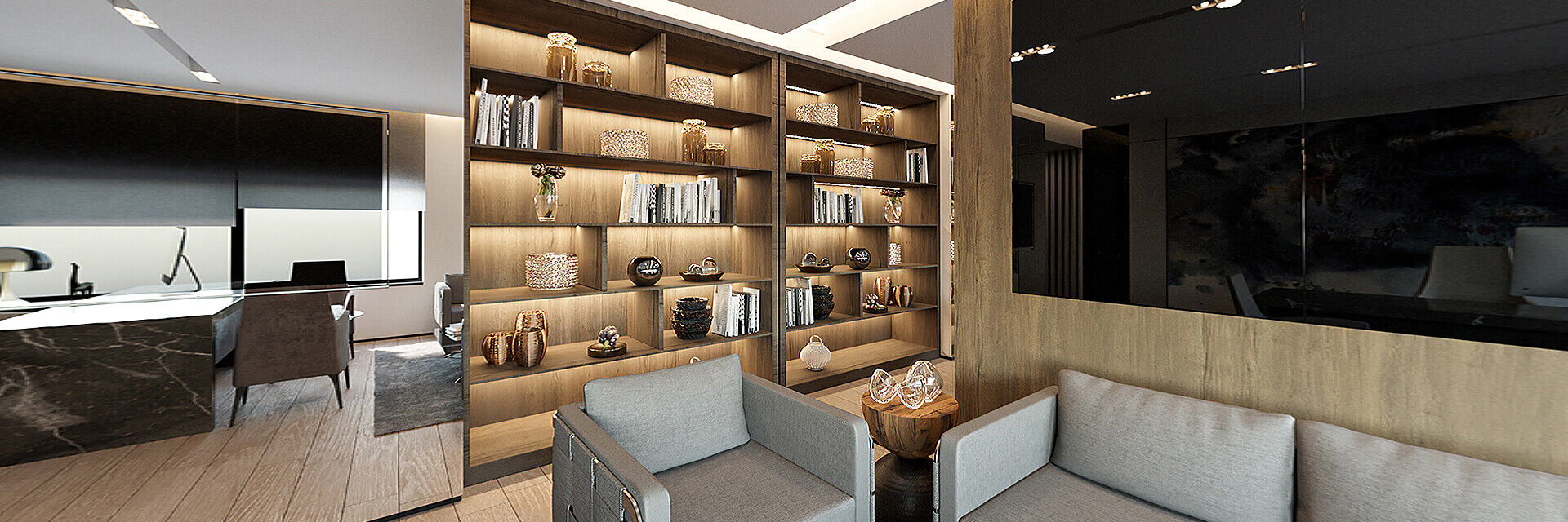 The office is composed of two floors and an executive floor. The visitors are welcomed by a dark-coloured reception desk featuring the company name with a wooden background and the mirrored walls provide the office with ample light at the entrance. The light-coloured seats at the waiting area are complemented with black and white setting. The office is separated from the waiting area by a glass wall with a plant feature, which adds a drop of nature to the environment.